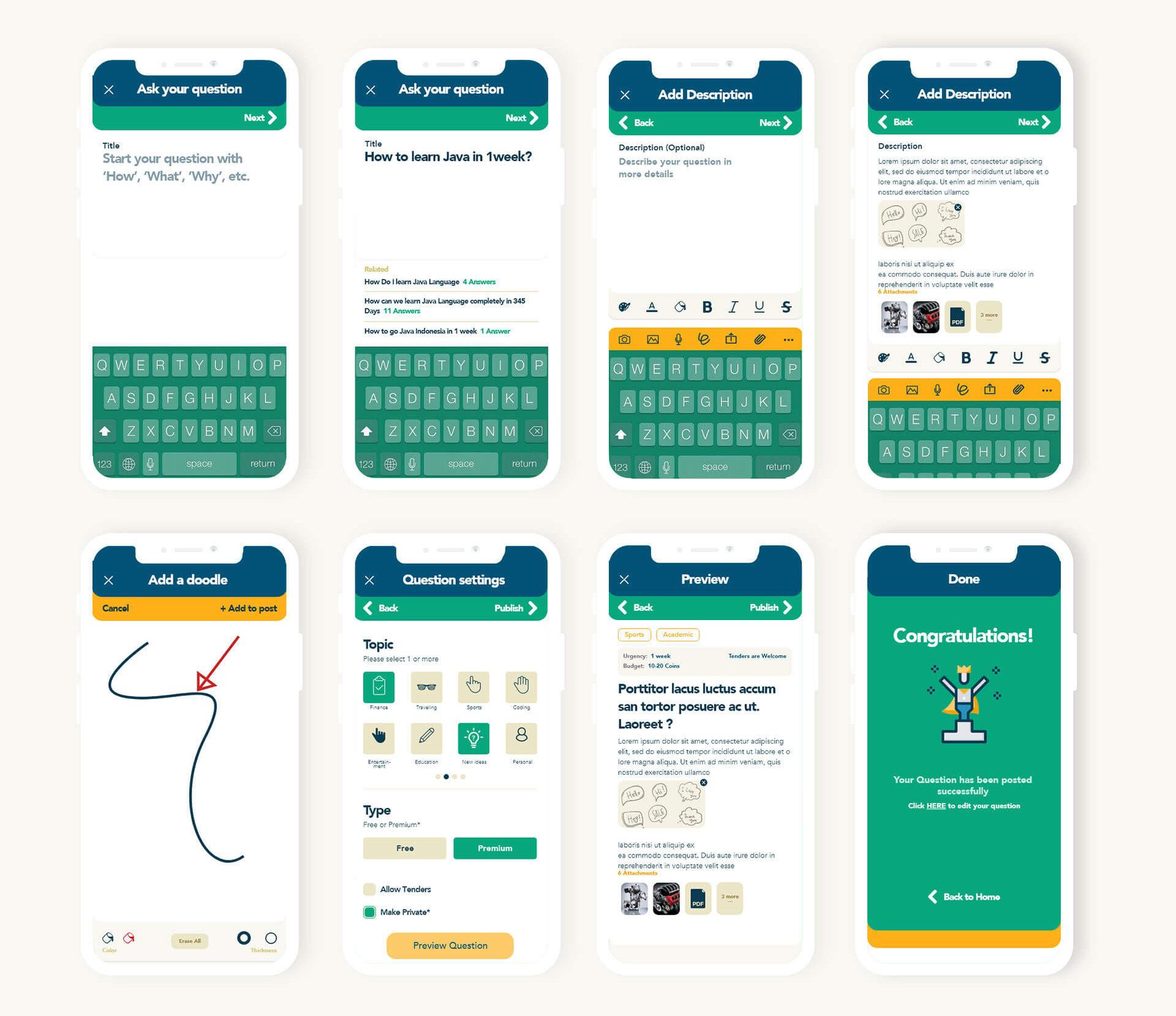 The design thinking process was chosen as a strategic decision to ensure Qitt’s success in a competitive market. This approach centered on understanding users’ needs and pain points, then refining features based on iterative feedback to produce a satisfying and engaging user experience. The parallel project with Algomerchant initiatives allowed for thorough research, ideation, and testing to create a well-crafted and innovative Q&A platform. Collaboration with Synamzter, as well as close collaboration among the CTO, app developers, and marketing manager, helped Qitt establish itself as a premium platform, distinguishing itself in the Q&A market and fostering meaningful connections among users.