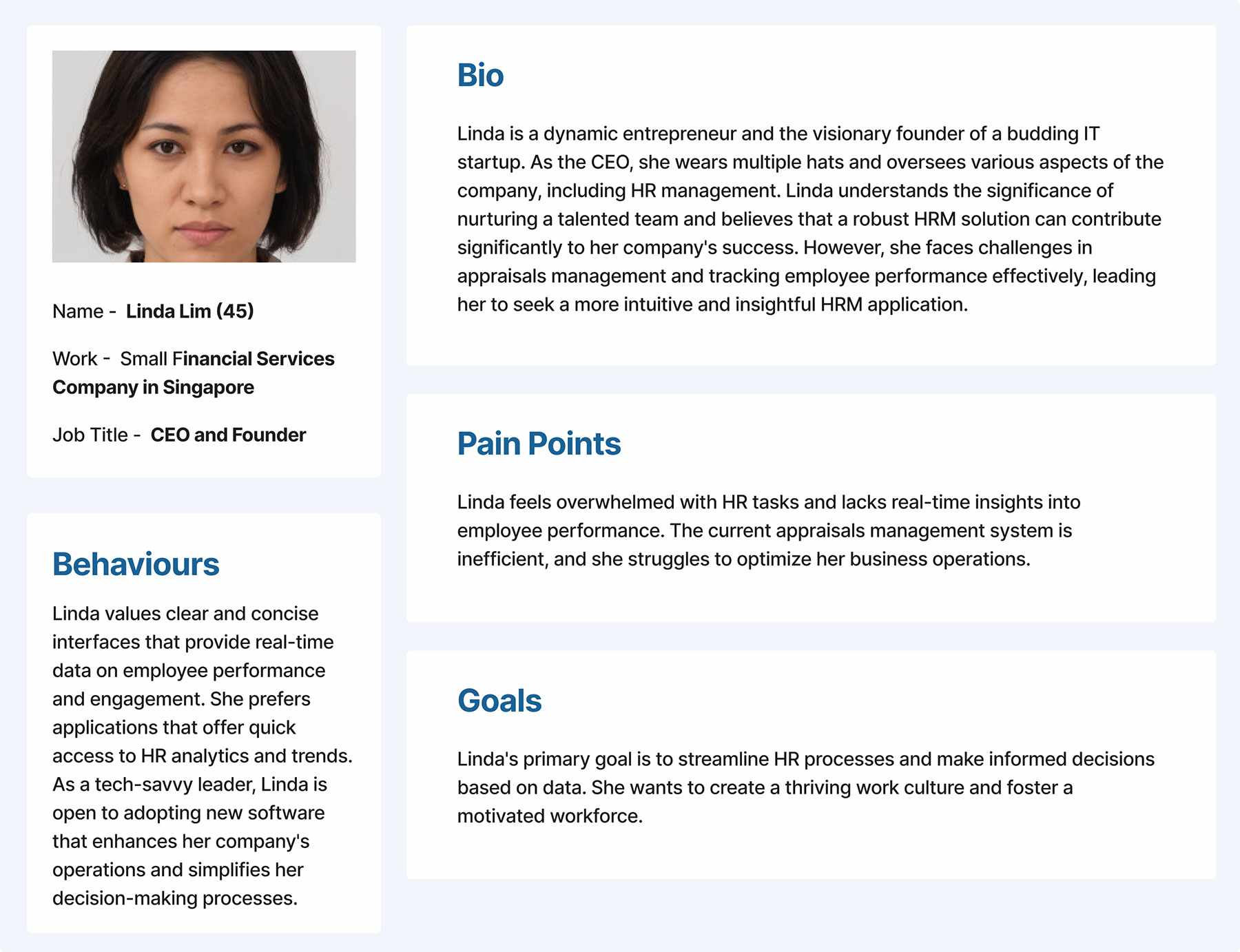 | Linda Lim | Appraisals Management | 3 | 5 | Inefficient Appraisals Interface | Develop an easy-to-use performance appraisal module with clear feedback. |