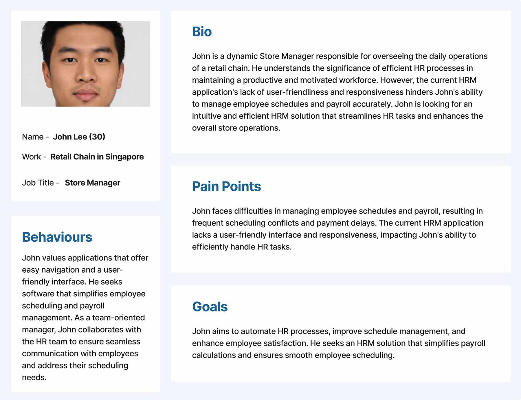 Next, I constructed a UX matrix that identified the key tasks, pain points, and goals of each user persona. This matrix served as a roadmap for the UX redesign, guiding us towards implementing solutions that would directly address user needs and pain points. By aligning our efforts with the UX matrix, we aimed to create an intuitive and efficient HRM solution that resonated with our target audience.
