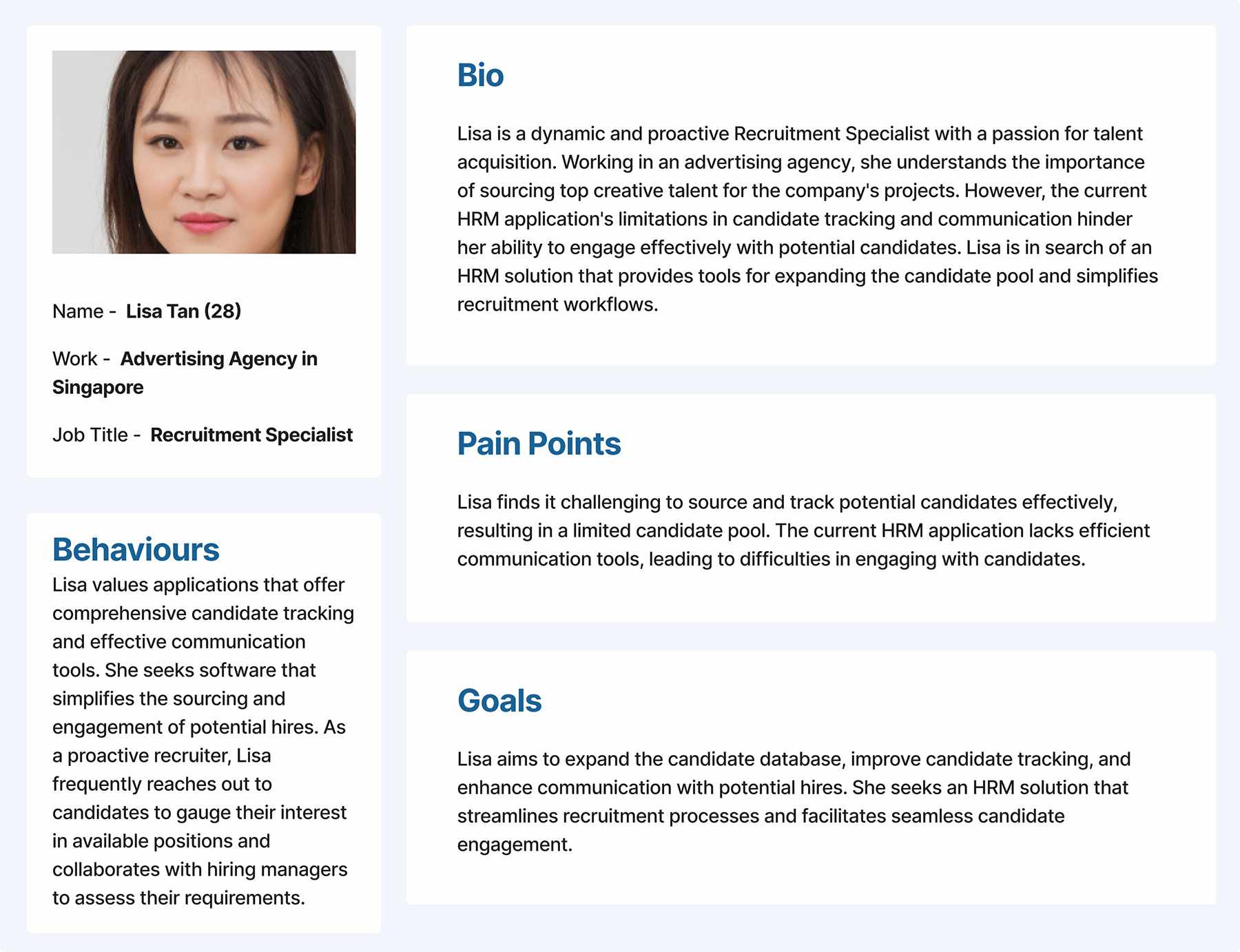 | Lisa Tan | Candidate Tracking and Communication | 3 | 5 | Tedious Candidate Tracking Process | Develop an organized candidate tracking system with effective communication tools. |
